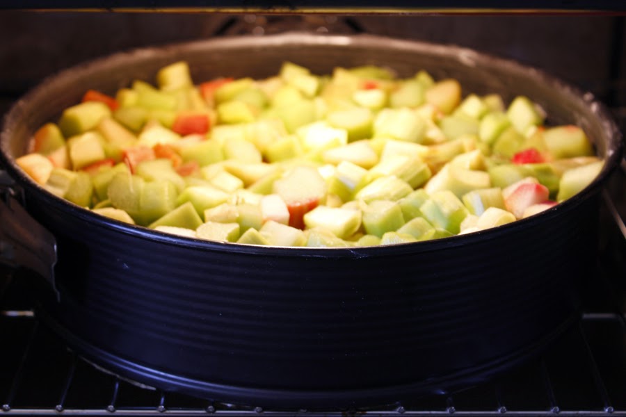- para o recheio descasque o ruibarbo, corte em cubos e acrescente o açúcar e o rum. deixe descançar.
