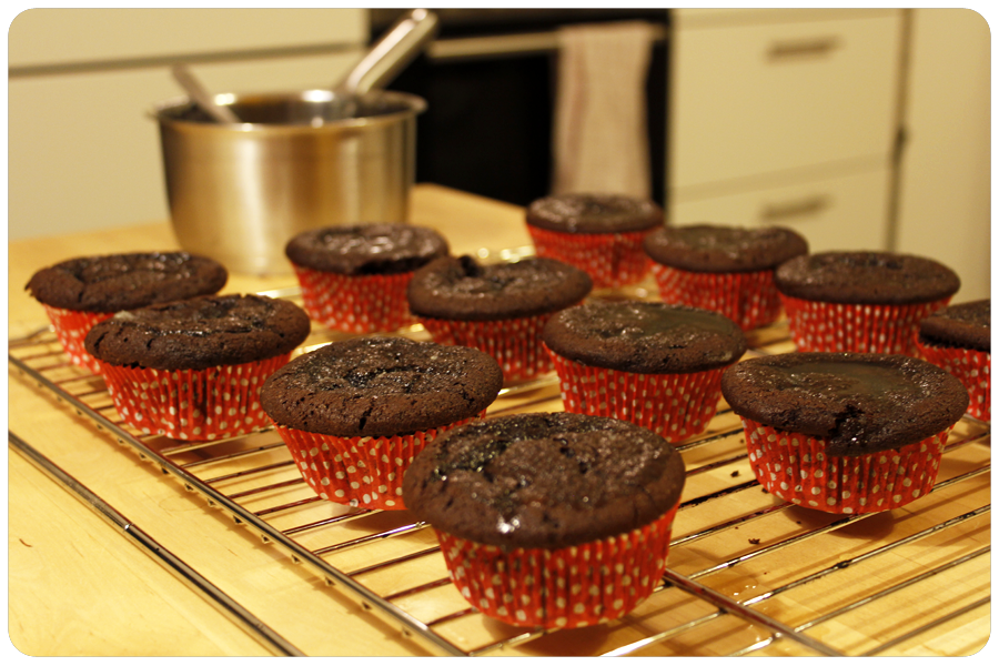 numa tigela misturei um ovo, 60ml de café bem forte, 60ml de whiskey, 120ml de buttermilk (pra quem tá no brasil, dá pra substituir assim) e 60gr de manteiga sem sal. aos poucos acrescentei 120gr de farinha de trigo, 65gr de chocolate em pó, 200gr de açúcar, 1 colher de chá de bicarbonato de sódio, 1/2 colher de chá de fermento e 1/2 colher de chá de sal. Bati bem. forrei com forminhas de papel uma forma para 12 muffins e distribuí a massa. assei por 20 minutos a 180°C.